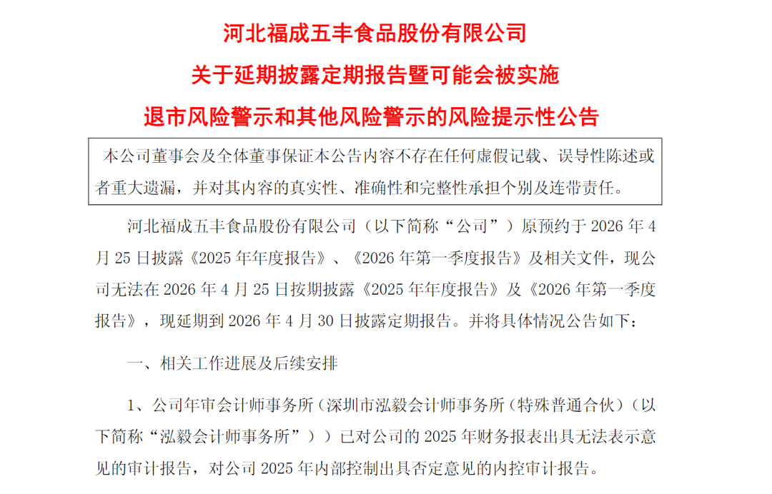4月24日晚,福成股份(600965)公告,根據(jù)《上市規(guī)則》,因公司年審會計師事務(wù)所泓毅會計師事務(wù)所已對公司2025年財務(wù)報表出具無法表示意見的審計報告,公司股票將被實施退市風(fēng)險警示(*ST),存在后續(xù)終止上市的風(fēng)險;因泓毅會計師事務(wù)所已對公司2025年內(nèi)部控制出具否定意見的內(nèi)控審計報告,公司股票將被實施其他風(fēng)險警示(ST)。