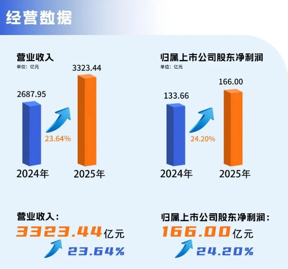 2025年全年,立訊精密(002475)實現(xiàn)營收3323.44億元,同比增長23.64%;歸母凈利潤為166億元,同比增長24.20%。