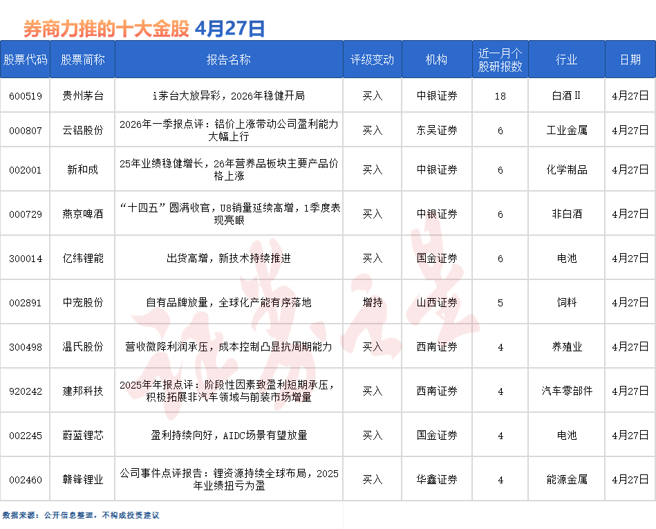 除了上述個(gè)股外,還有燕京啤酒(000729)、億緯鋰能(300014)、中寵股份(002891)、溫氏股份(300498)、建邦科技、蔚藍(lán)鋰芯(002245)、贛鋒鋰業(yè)(002460)等多股備受券商關(guān)注。