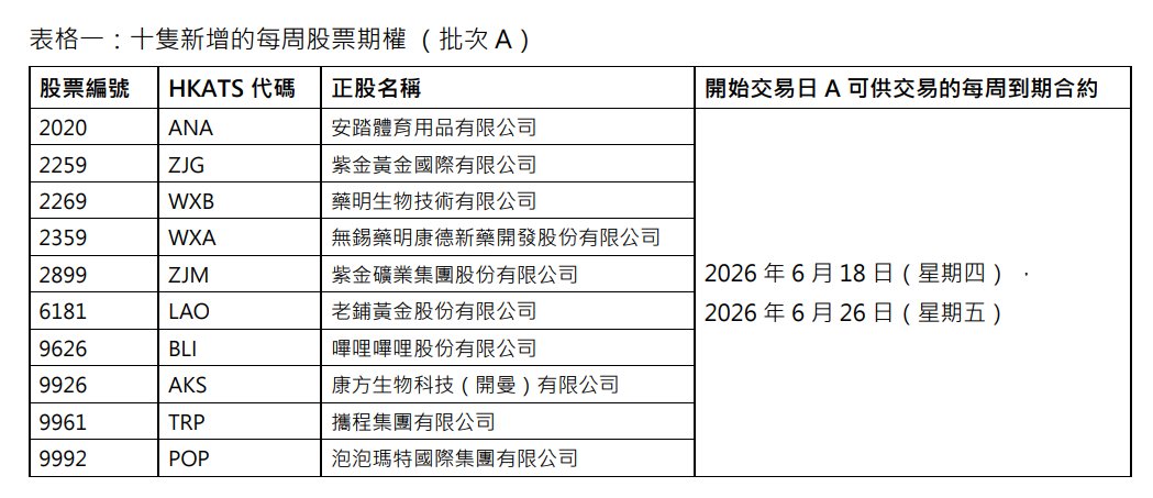 4月27日,香港聯(lián)交所宣布將新增每周到期股票期權(quán)到更多股票期權(quán)類別,合共17只每周股票期權(quán)將分兩個批次于連續(xù)兩星期推出。當(dāng)中10只新增每周股票期權(quán)(批次A)將于2026年6月15日(星期一)開始交易(“開始交易日期A”),包括紫金黃金國際(HK2259)(02259)等,而其余7只每周股票期權(quán)(批次B)將于2026年6月22日(星期一)開始交易(“開始交易日期B”),包括新鴻基地產(chǎn)(HK0016)(00016)等。