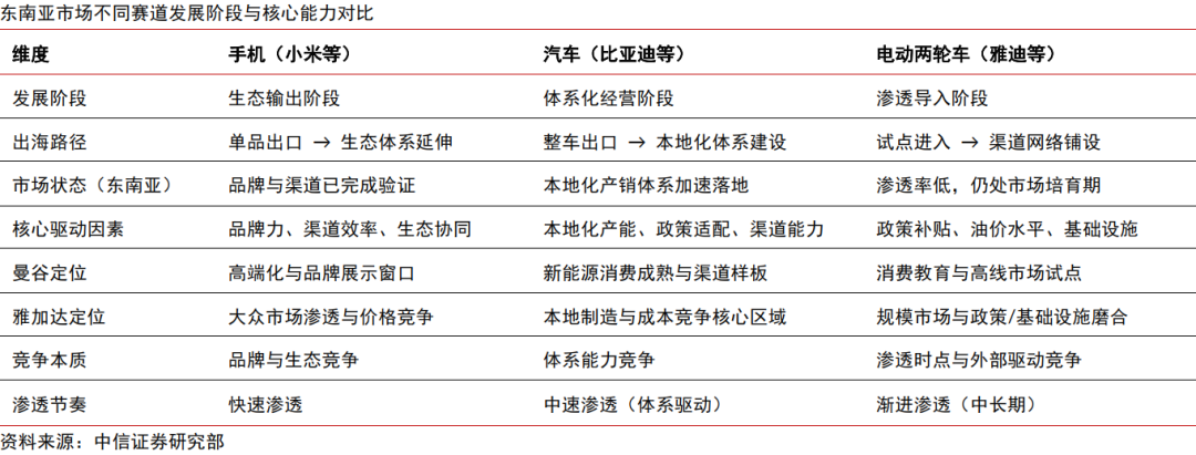 手機(jī)賽道最為成熟,中國(guó)品牌已率先完成由“性價(jià)比輸出”向“品牌+生態(tài)輸出”的升級(jí),在泰國(guó)推動(dòng)高端化與體驗(yàn)式零售,在印尼承接大眾價(jià)格帶需求;汽車賽道競(jìng)爭(zhēng)已進(jìn)入體系化經(jīng)營(yíng)階段,中國(guó)車企由整車出口逐步轉(zhuǎn)向渠道建設(shè)、本地化產(chǎn)能布局及政策協(xié)同并重的區(qū)域經(jīng)營(yíng)模式;兩輪車(885974)則具備較大的需求基礎(chǔ)與增長(zhǎng)潛力,但當(dāng)前仍處滲透初期,其發(fā)展節(jié)奏取決于成本條件、基礎(chǔ)設(shè)施與政策環(huán)境等多重因素。整體來(lái)看,各賽道節(jié)奏不同,但均指向中國(guó)制造向中國(guó)品牌的升級(jí)路徑。
