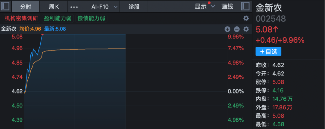豬肉(885573)、雞肉、飼料、動物保健(884013)等細分板塊也紛紛跟漲,金新農(nóng)(002548)(002548)強勢漲停,華統(tǒng)股份(002840)、乖寶寵物(301498)、生物股份(600201)、唐人神(002567)等漲幅居前。