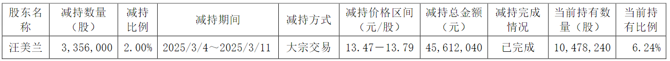 2025年3月4日至2025年3月11日,汪美蘭通過大宗交易方式減持公司股份3,356,000股,占公司總股本的2.00%,本次減持計劃(883921)已實施完畢,減持總金額4561.20萬元。