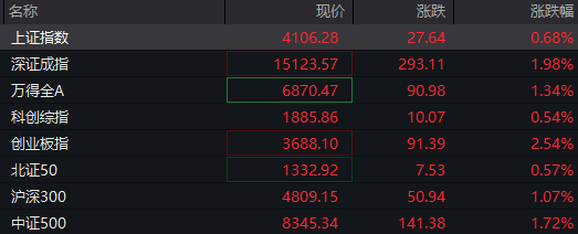 截至發(fā)稿,滬指站上4100點(diǎn),創(chuàng)業(yè)板指(399006)漲超2.5%,深證成指(399001)漲近2%,科創(chuàng)綜指(1B0680)漲0.54%,全市場(chǎng)超4000只個(gè)股飄紅。