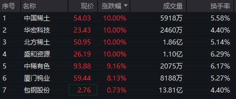 Wind稀土(884215)指數(shù)大漲超8%。中國(guó)稀土(000831)、華宏科技(002645)、北方稀土(600111)、盛和資源(600392),全部“10CM”漲停,總成交額超157億元。中稀有色(600259)距離漲停僅一步之遙,廈門鎢業(yè)(600549)同樣大漲超8%。