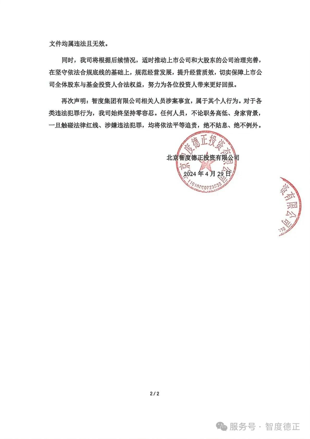 另外,4月27日,智度德正發(fā)布《關(guān)于智度集團(tuán)有限公司章程修訂及管理權(quán)調(diào)整的公告》稱,2026年4月23日,智度集團(tuán)的全資股東智度德正依法作出股東決定,對全資子公司智度集團(tuán)及下屬公司的管理權(quán)進(jìn)行調(diào)整,相關(guān)上市公司的投票權(quán)及集團(tuán)出具的對外文件,最終由北京智度德正投資有限公司決定,任何未經(jīng)其同意的投票及對外文件均屬違法且無效,該決定已同時(shí)通知給智度集團(tuán)監(jiān)事和管理層。