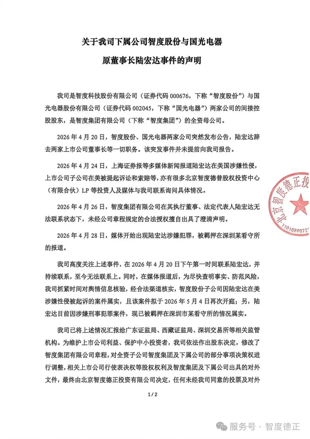 4月29日,智度集團(tuán)有限公司(以下簡稱“智度集團(tuán)”)全資股東北京智度德正投資有限公司(以下簡稱“智度德正”)發(fā)布聲明稱,經(jīng)合法渠道核實(shí),智度股份(000676)子公司因陸宏達(dá)在美涉嫌性侵被起訴的案件屬實(shí),且該案件擬于2026年5月4日再次開庭;另陸宏達(dá)目前因涉嫌刑事犯罪案件,現(xiàn)已被羈押在深圳市某看守所的情況屬實(shí)。