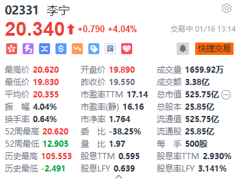 上證報(bào)中國(guó)證券網(wǎng)訊(記者 劉逸鵬)1月16日,李寧一度漲超5%,截至13時(shí)14分,漲4.04%,報(bào)20.34港元/股。