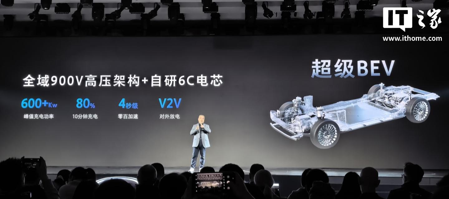 超級(jí)BEV則采用全域900V高壓架構(gòu)+自研6C電芯,峰值充電功率超600kW,10分鐘充電80%,零百加速4秒級(jí),支持V2V對(duì)外放電。