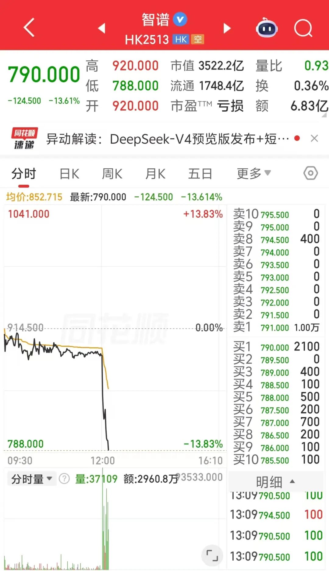 港股午后跳水跌13.61%,報790.00港元。