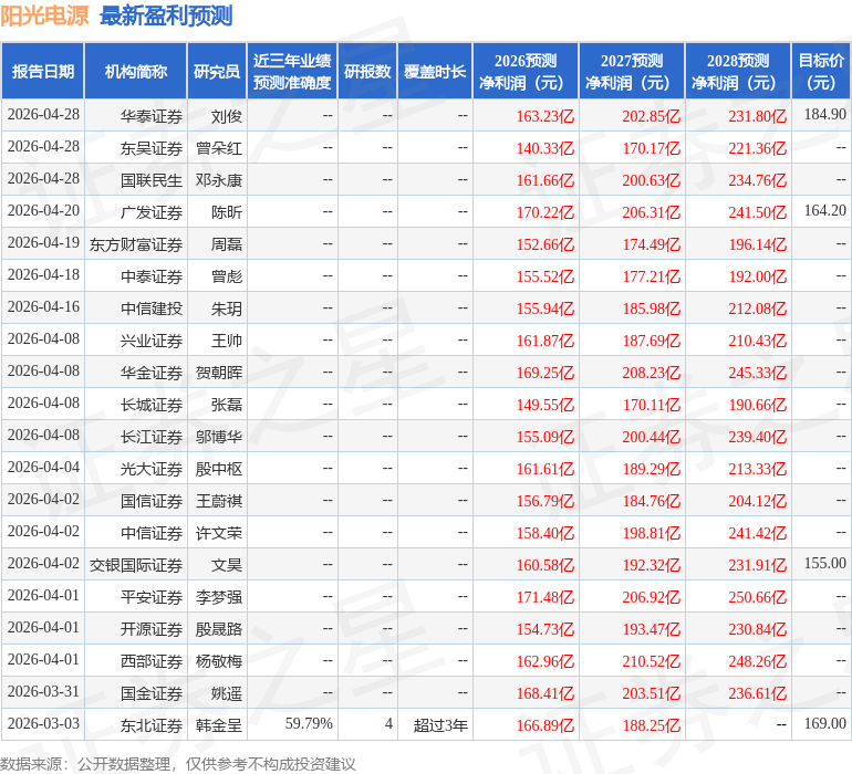 最新盈利預(yù)測(cè)明細(xì)如下: